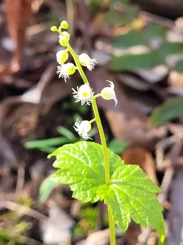Bishop’s Cap is a flowering, herbaceous perennial native to North America. It is a small plant, reaching about a foot in height or width. This slender, woodland plant with tiny white, fringed flowers of 5 delicate petals blooms in the spring. It has basal leaves that are heart-shaped and hairy-stemmed as well as a pair of similar, but stemless, leaves two-thirds up the flower stalk.